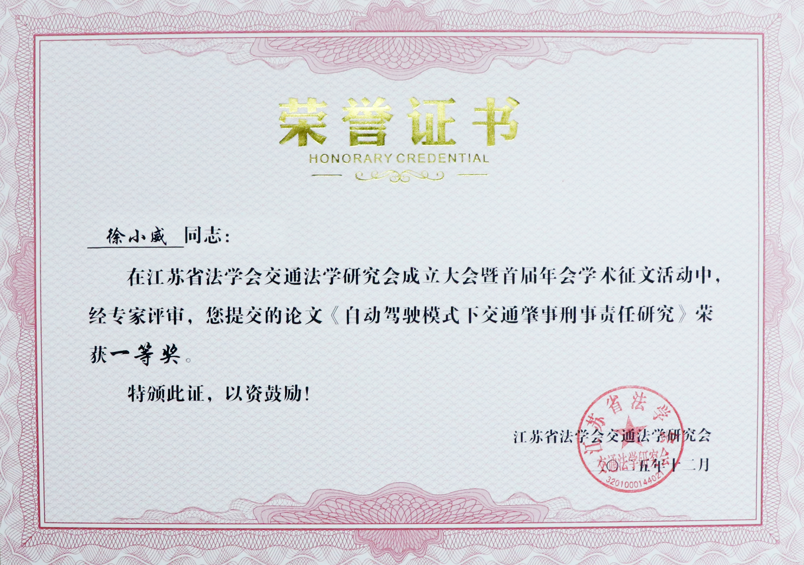 近日,江苏省法学会交通法学研究会成立大会暨首届年会在南京隆重举行,云龙区检察院政治部副主任徐小威应邀出席,并在现场作交流发言。撰写的论文《自动驾驶模式下交通肇事刑事责任研究》荣获一等奖。